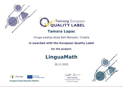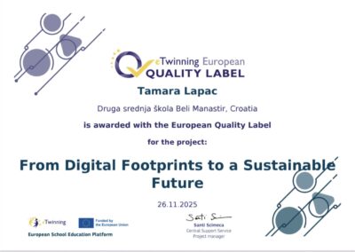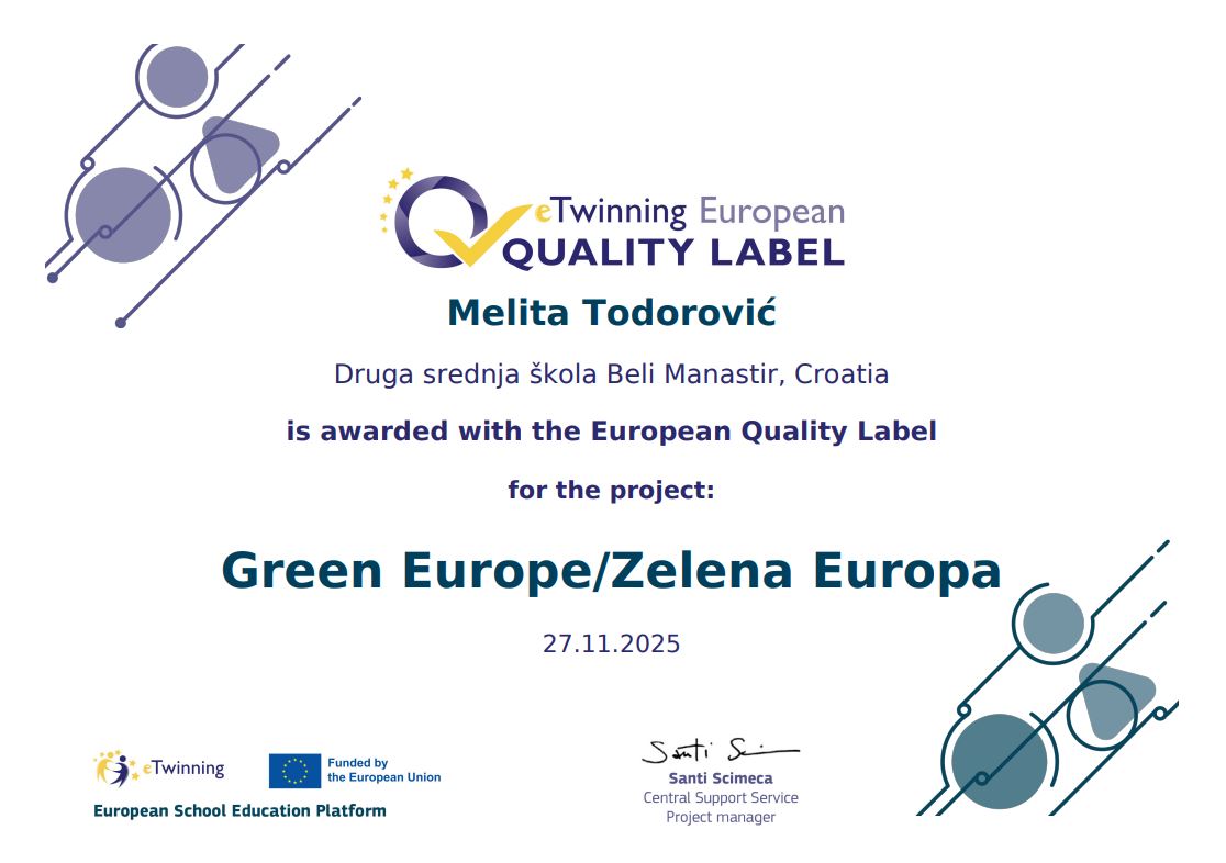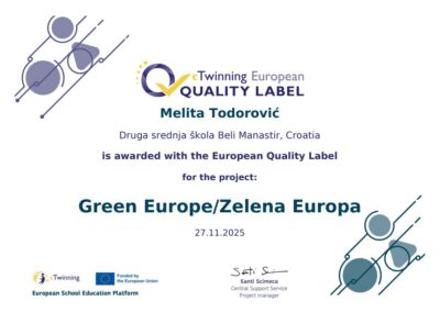 Nakon dodijeljene Nacionalne oznake kvalitete (NQL) profesorici stručnih predmeta Meliti Todorović za eTwinning projekt Green Europe/ Zelena Europa i profesorici engleskog jezika Tamari Lapac za eTwinning projekte Linguamath i From Digital Footprints to a Sustainable Future, profesoricama je za iste projekte dodijeljena i Europska oznaka kvalitete (EQL) za sva tri projekta u kojima su sudjelovale sa svojim učenicima.